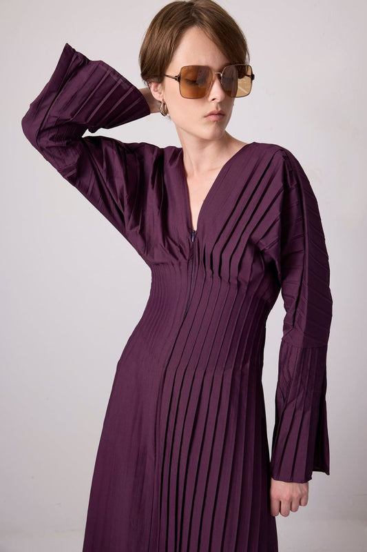 V-NECK PLEATED DRESS-Burgundy