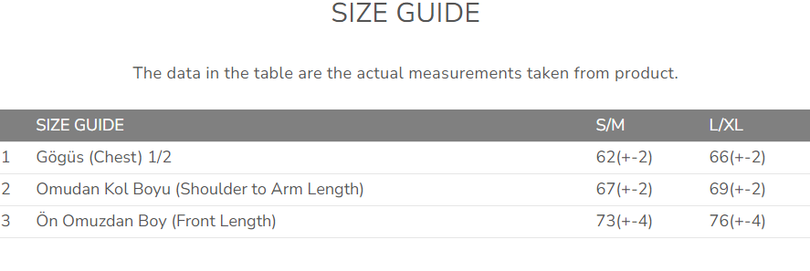 The measurements specified in the size chart are general body measurements. Since knitwear has a soft texture and flexible structure by nature, final measurements may differ.