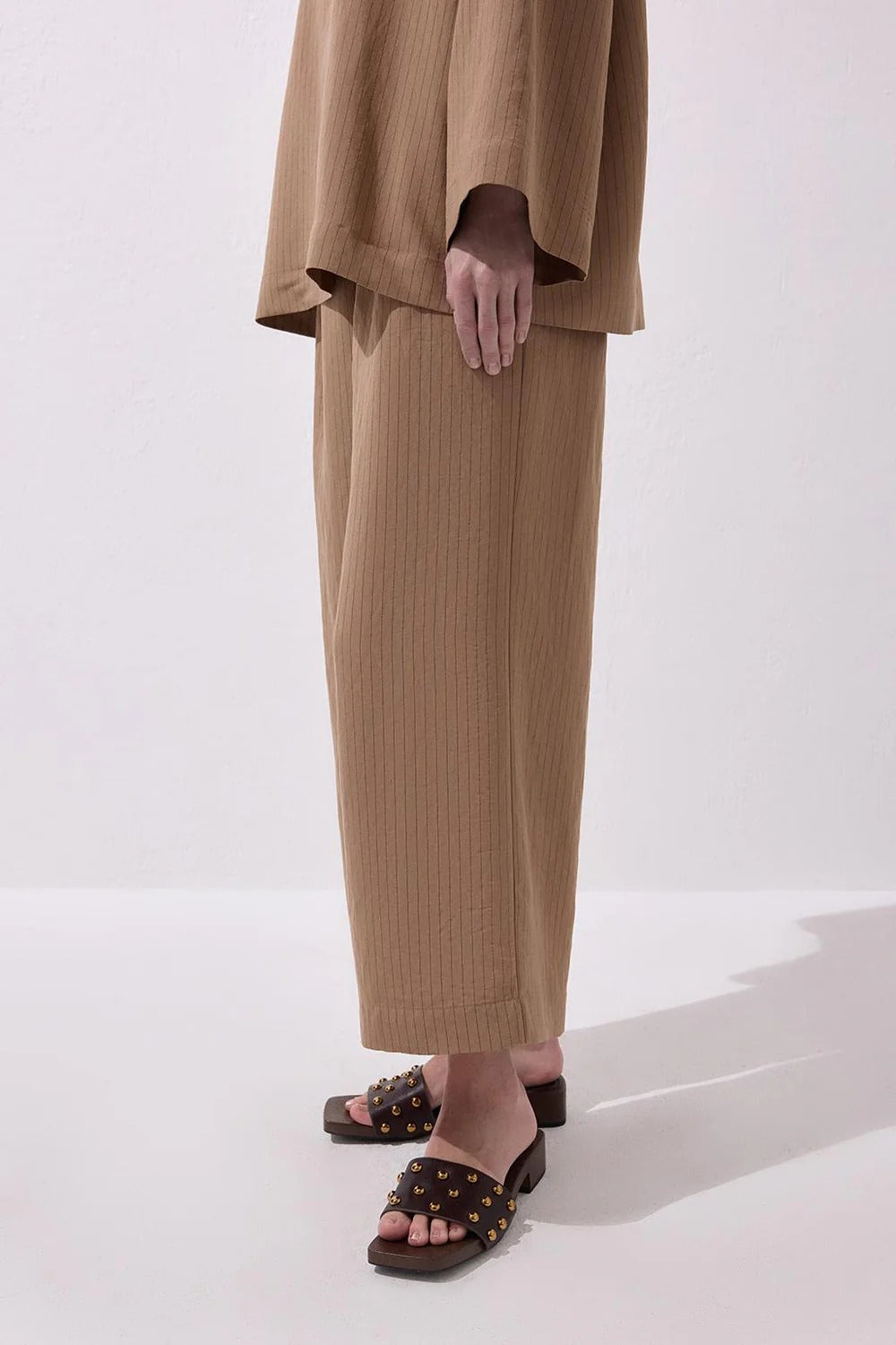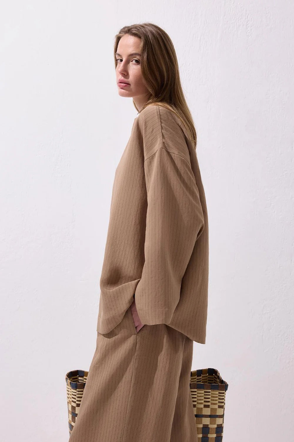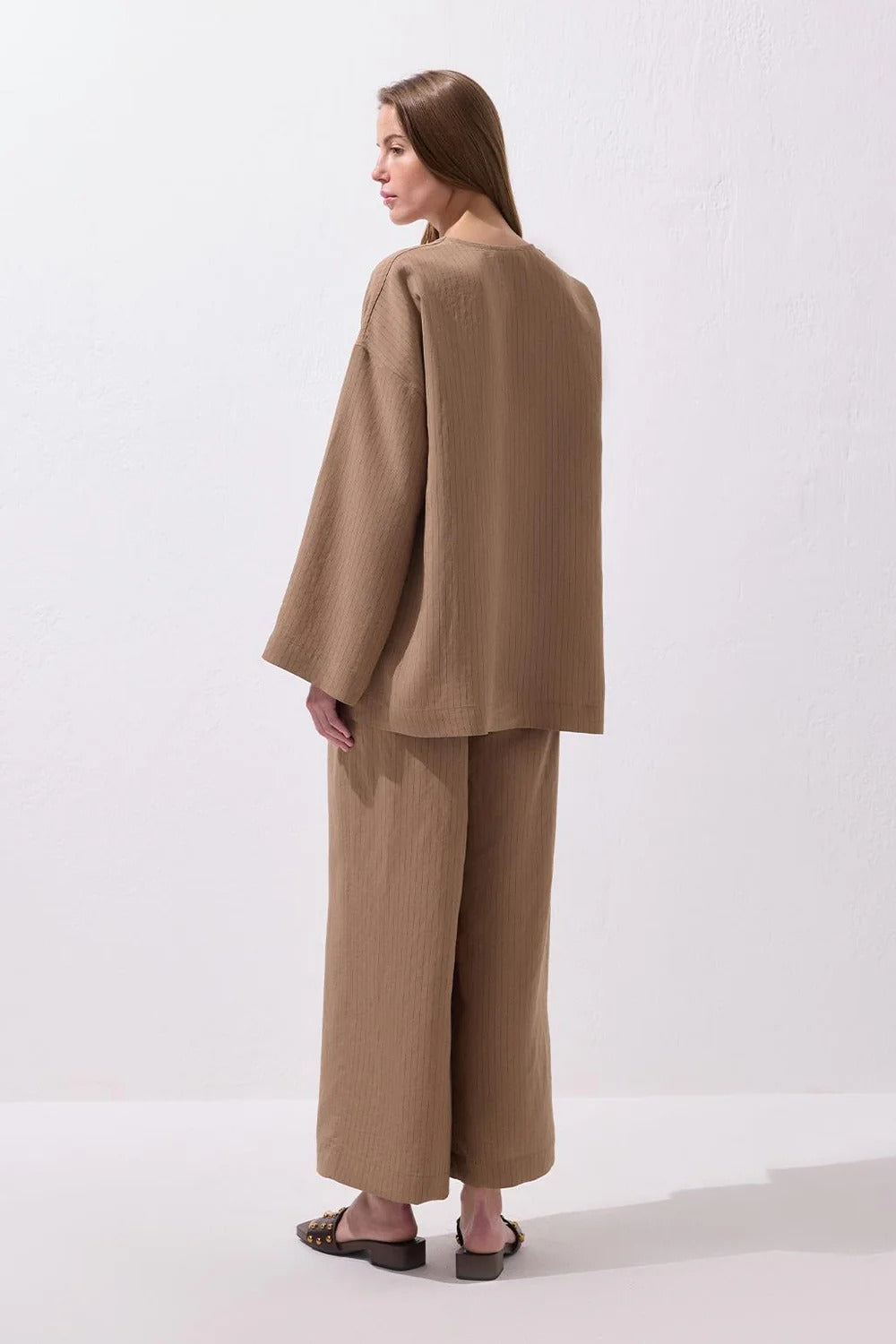 The Dory Modal Blouse and Pants Set in Camel combines modern cuts with drapey modal fabric for the perfect blend of comfort and style. The wide neckline and relaxed fit of the blouse offer all-day comfort, while the elastic waistband on the pants provides freedom of movement. Whether worn during workdays or on the weekend, this set becomes a timeless piece with endless styling options. The chic blouse and comfortable pants highlight your style in any setting, and with different accessories, you can create both sporty or sophisticated looks. With the versatility of each piece, this set adds both functionality and elegance to your wardrobe.
