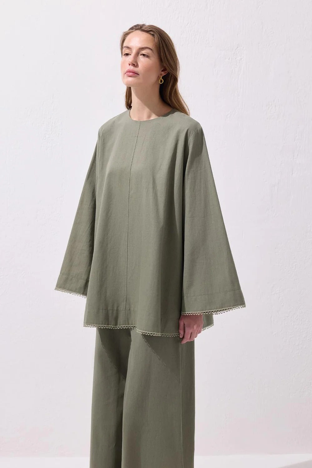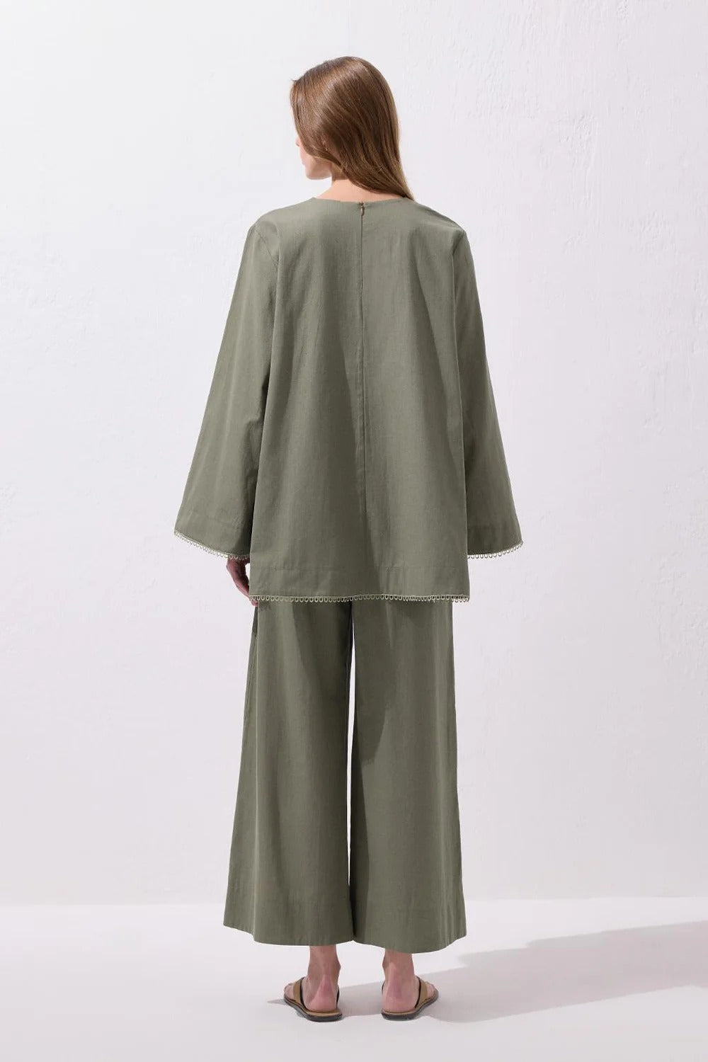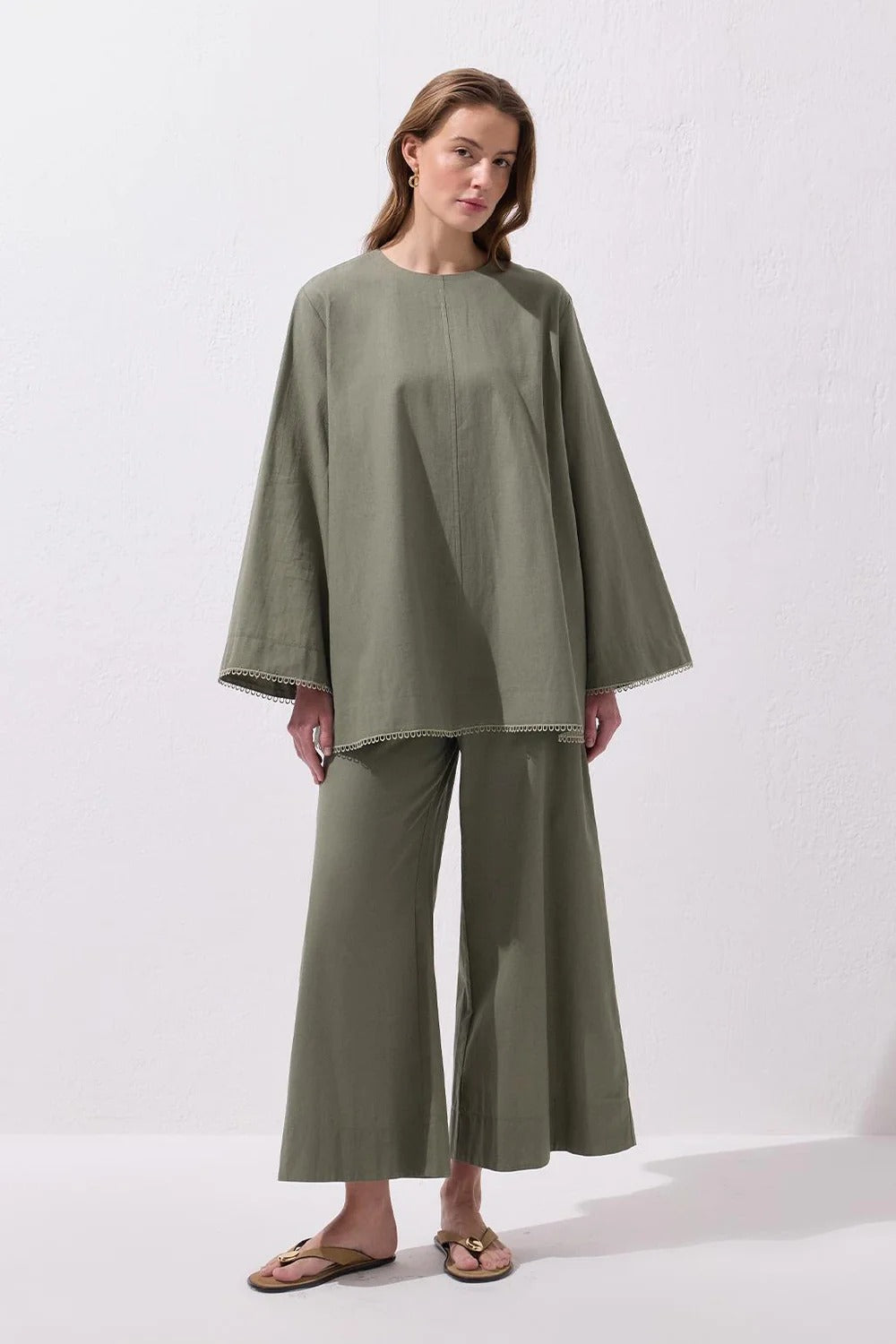 The Faye Lace Linen Blouse and Trousers Set in Khaki is crafted from a breathable and lightweight viscose-blend linen fabric, providing both comfort and style. The bike-neck blouse features wide sleeves and elegant hem details, while the lace trim on the cuffs adds a sophisticated touch. The high-waisted pants offer a relaxed fit, ensuring freedom of movement throughout the day. Perfect for completing your everyday chic look or creating refined ensembles for special occasions.