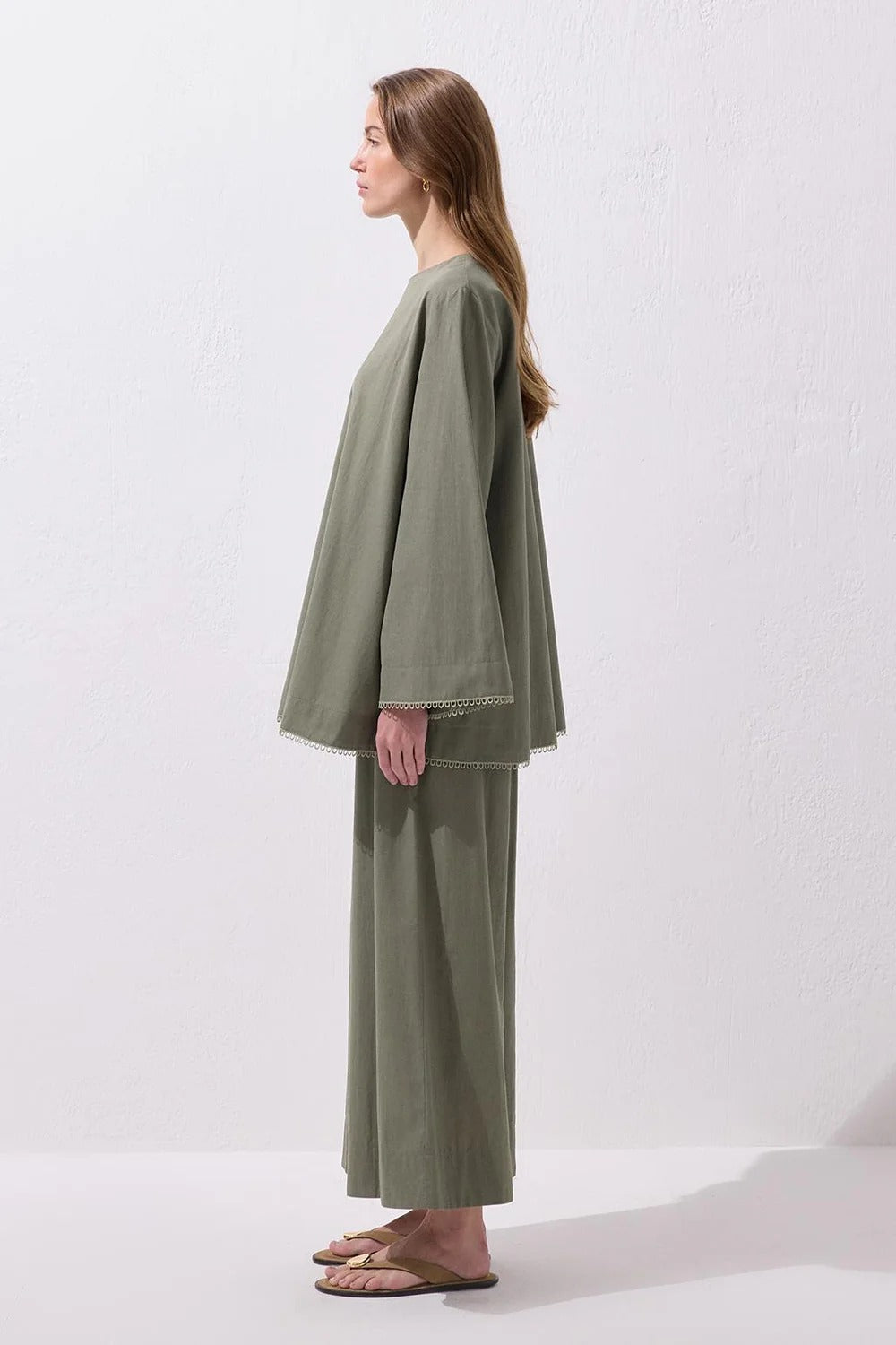 Faye Lace Linen Blouse and Trousers Set Sage Green