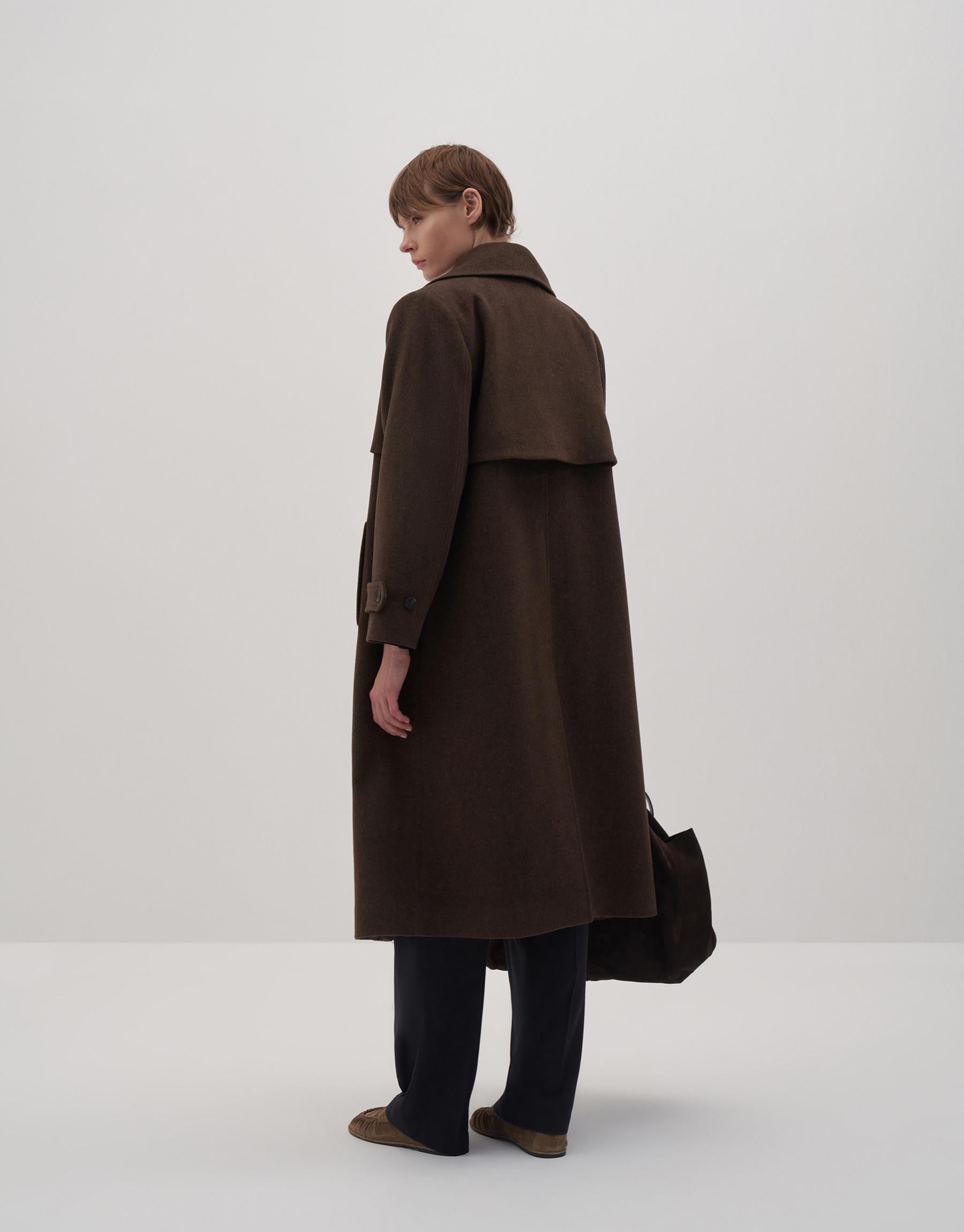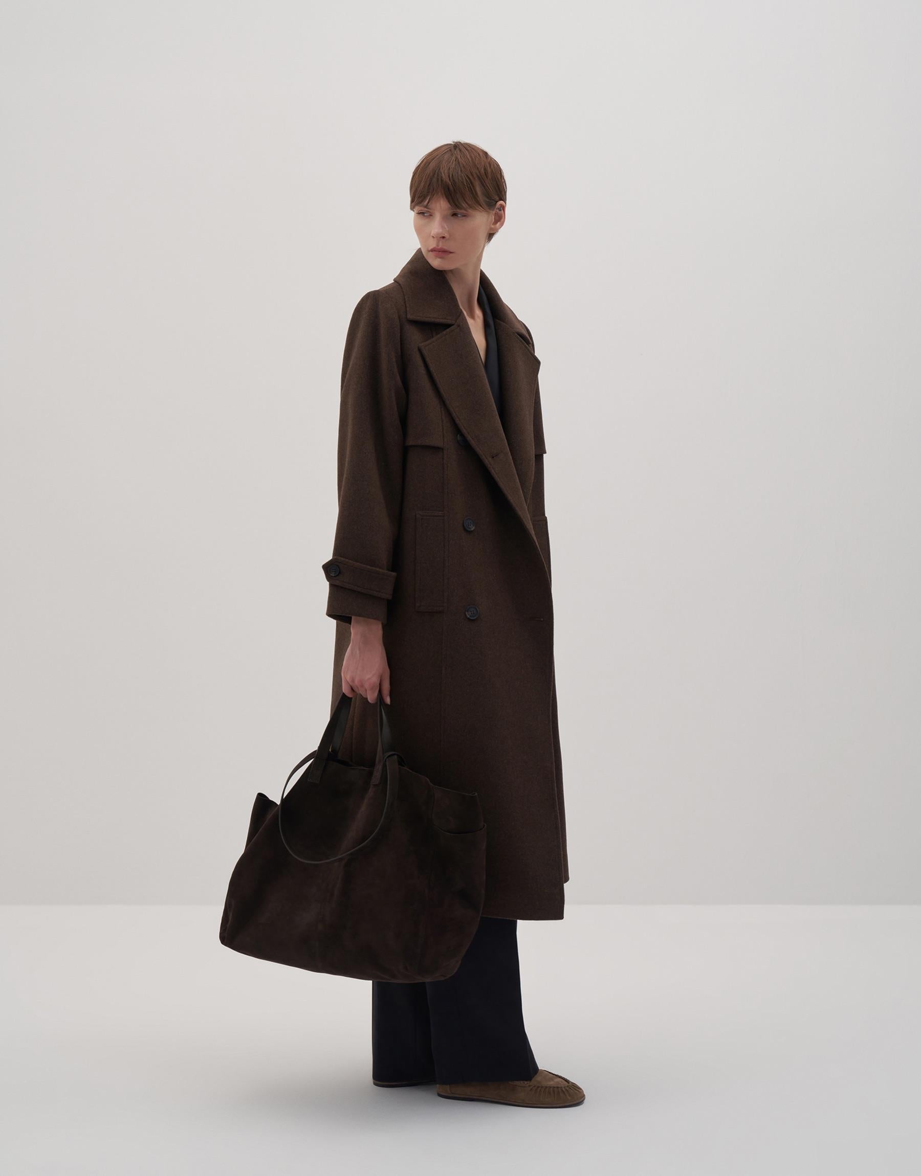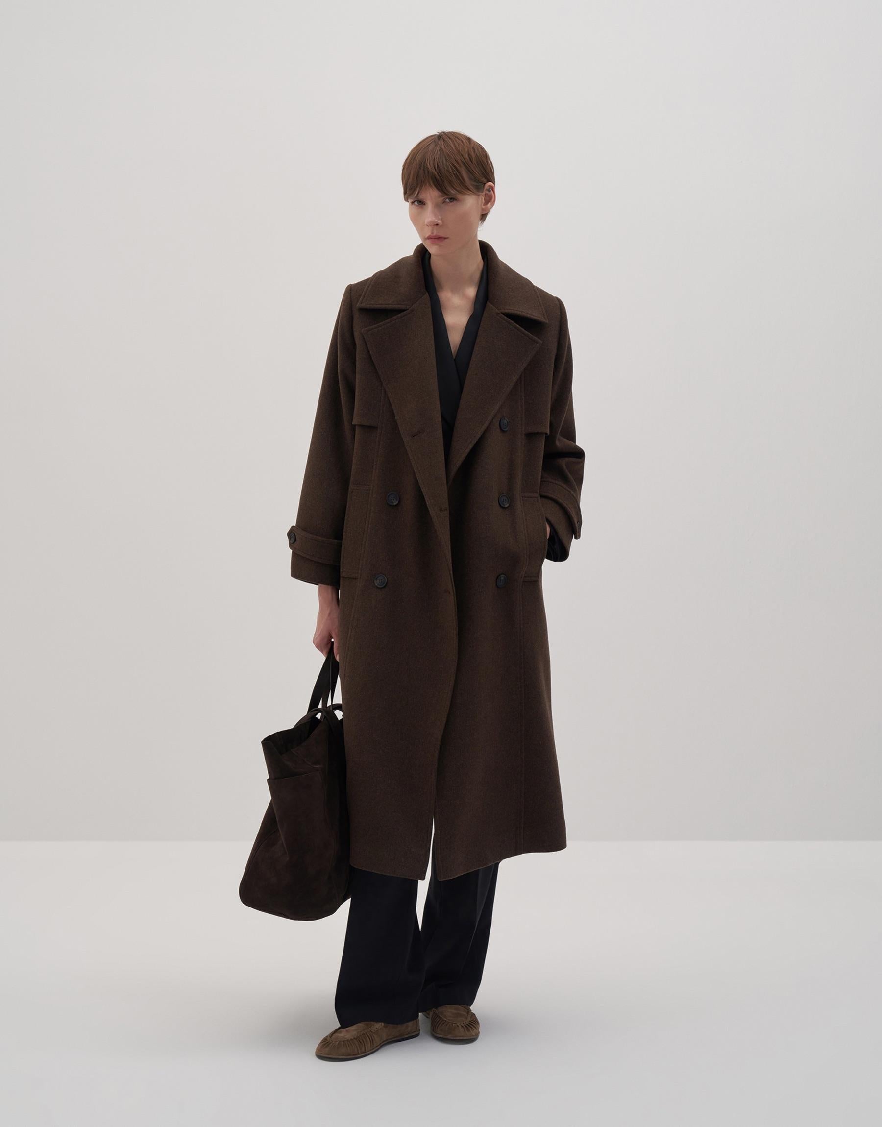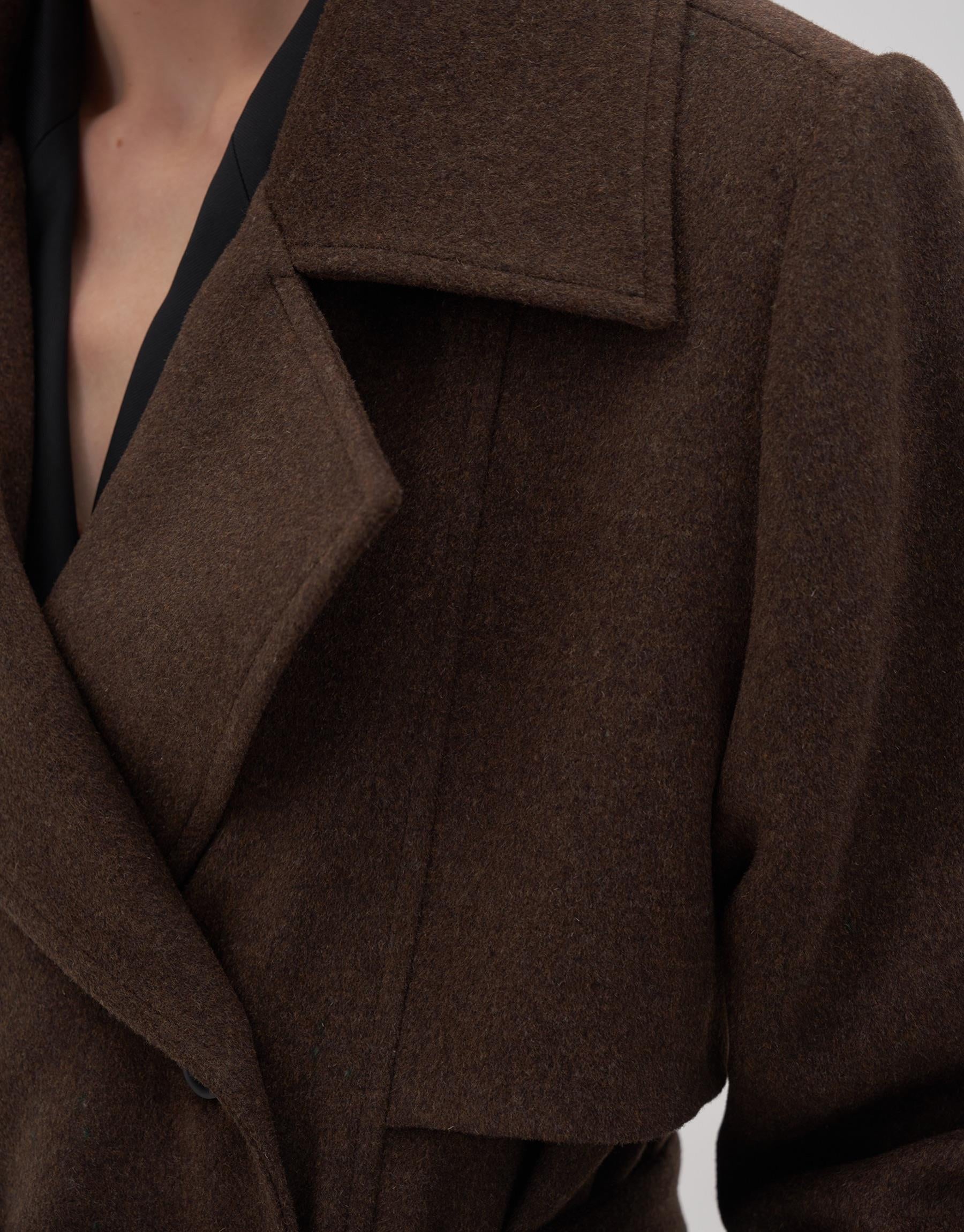 Product Details: Double-breasted button closure. Lapel collar. Belted. Welt front pockets. Long sleeves with buttoned bands.