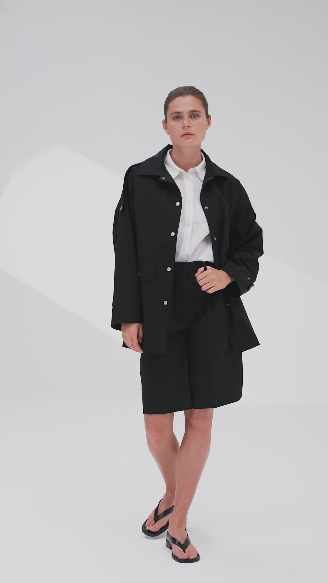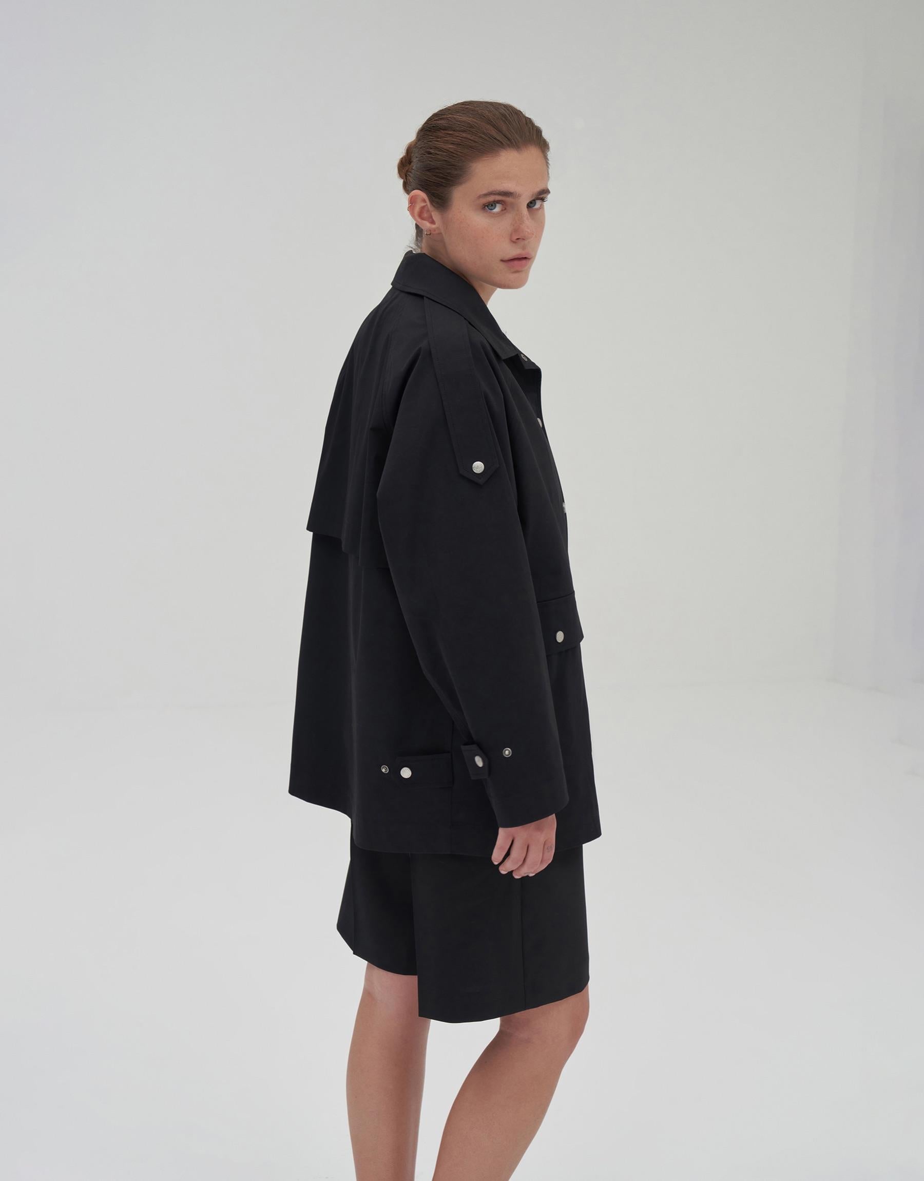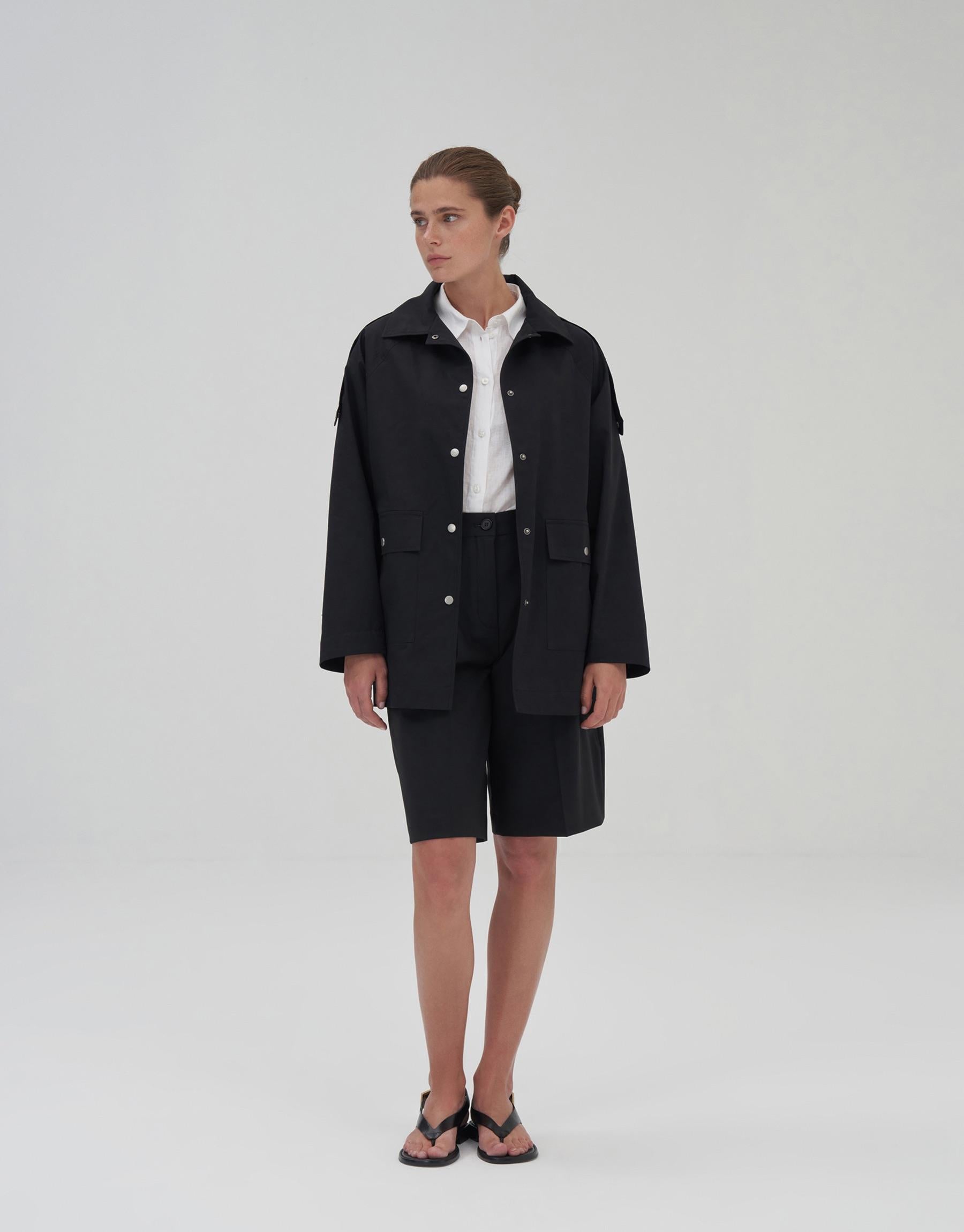 Product Details: Snap closure on the front. Raglan sleeves. Two flap pockets on the front body. Epaulette detail on the shoulders.